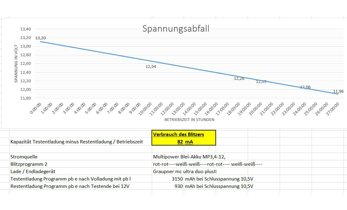 Der Stromverbrauch wurde durch einen praktischen Versuch nachgewiesen. Verwendet wurde ein 12 V - 3,4 Ah Multipower Blei Akku.